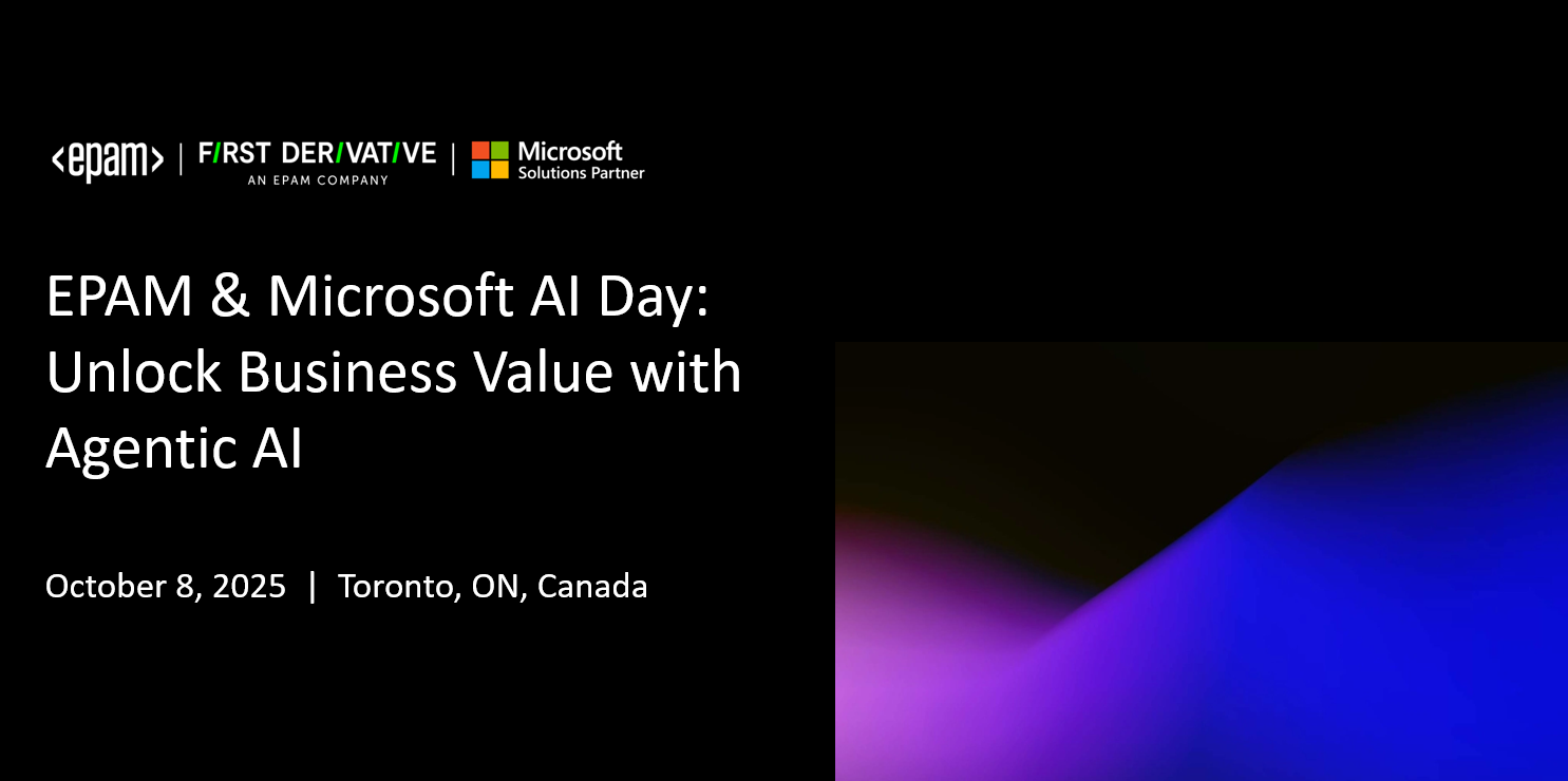 Join EPAM, Microsoft and First Derivative (an EPAM company) for an exclusive event that explores how organizations can successfully navigate and harness the AI-driven future. Through expert insights, real-world examples, and actionable strategies, you will gain a clear understanding of how to transition from experimentation to scalable AI adoption, ultimately impacting your business.
